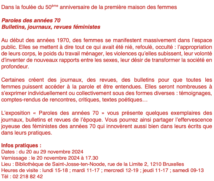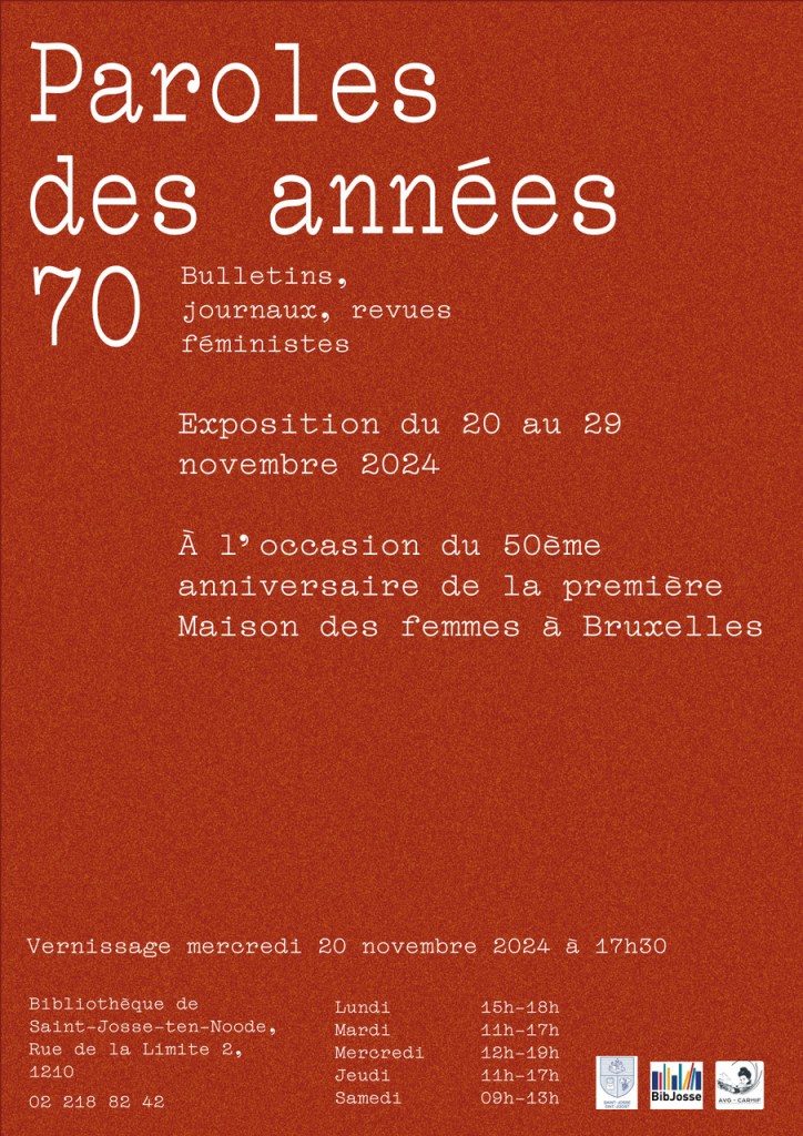 Dans le cadre du 50ème anniversaire de la naissance de la Maison des Femmes à Saint-Josse, vous êtes les bienvenu.e.s au vernissage de l’exposition « Paroles des années 70 », le mercredi 20 novembre à 17h30 à la Bibliothèque.